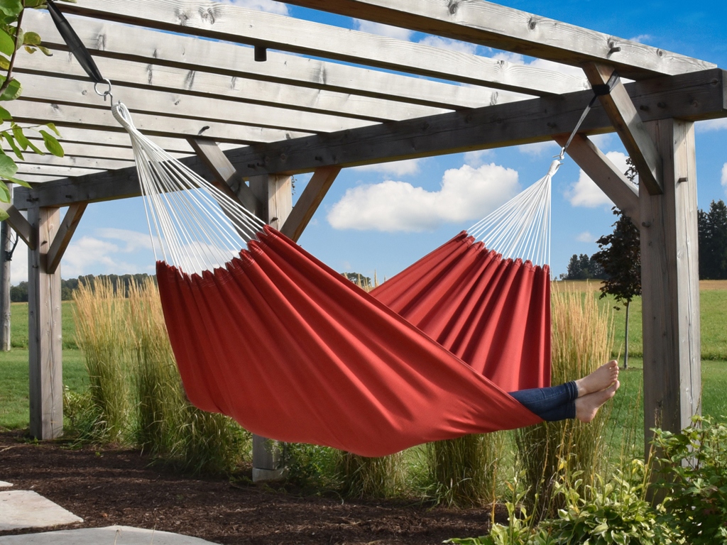 Dwuosobowy hamak brazylijski wykonany z trwałej tkaniny Sunbrella, która jest odporna na warunki atmosferyczne.